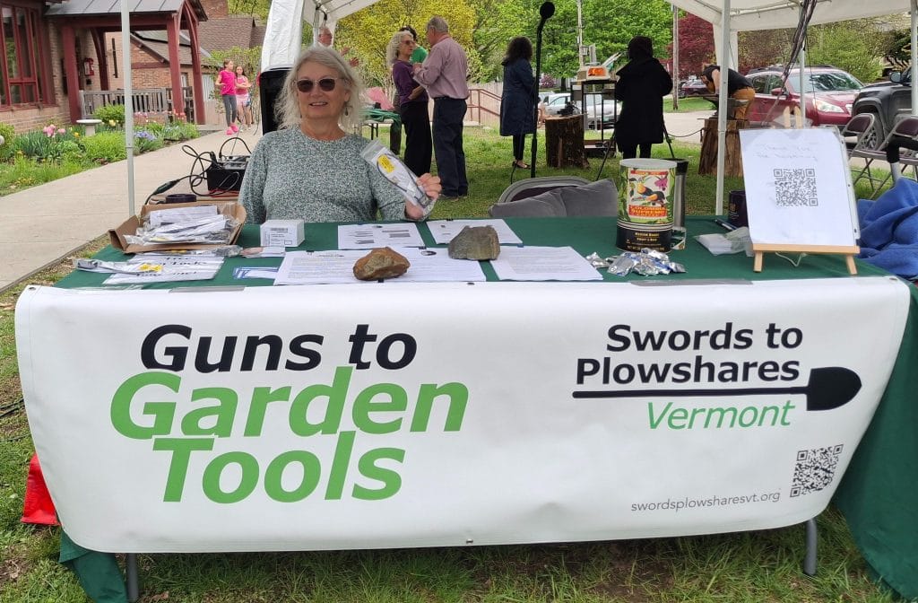 Stop by and see Swords to Plowshares, VT during Gallery Walk in Brattleboro, on the first Fridays in the months of May – October, from 5:00 to 7:30 p.m. We will be set up in the Harmony Lot on Elliot St. There will be information about our organization, garden tools made from unwanted guns for sale, t-shirts for sale, and FREE gun locks. See https://www.brattleboro.com/downtown/gallery-walk/